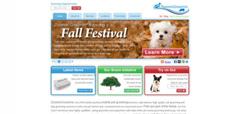 Zoomin Groom is a corporate image website with a zip code locator, and scheduler built in by a 3rd party company. The website was developed and given a solid back end that supported all future modifications and additions. http://www.zoomingroomin.com/