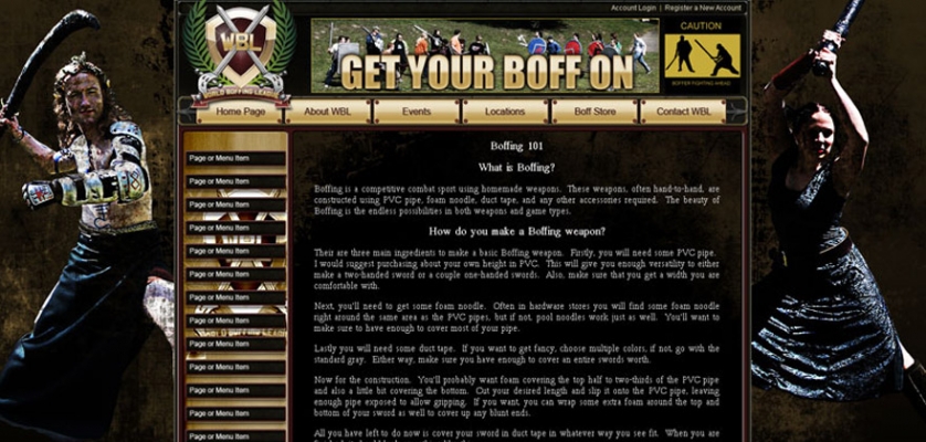 This website was created to allow for boffers from around the world to contact each other, locate other teams, place wagers, and sell their home-made equipment (armor, weapons, etc..) to fellow boffers, and allow the site to collect membership fees, and a percentage of the profits. http://www.worldboffingleague.com/