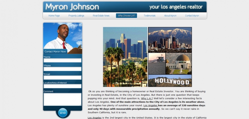 This website was designed as a personal image, and property showcase website that allowed for the realtor to get his customers familiar with him, as well as allow for a large feed of houses, and rentals to be available to list to provide the end user with an idea of some of the homes available for purchase. http://www.myronjohnsonrealestate.com/